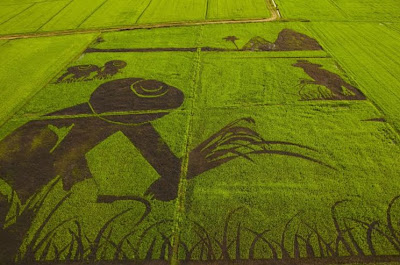 A nova do Greenpeace foi “esculpir” num campo de arroz uma ilustração contra os transgênicos.