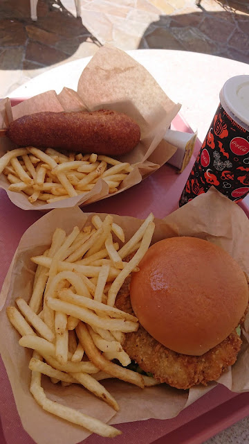 De lá, paramos no Stage Door Café para almoçar. O prato da vez foi…. frango! Mais uma vez hehehe… E para felicidade do Maurício azarado, apimentado de novo kkk… Estava bem tranquilo o movimento, então nossa missão foi encontrar uma mesa na sombra para almoçar com vista para o Rivers of America e os barcos Mark Twain e Columbia. É nessa área que acontece o Fantasmic, a apresentação do Mickey com luzes e água ao cair da noite.